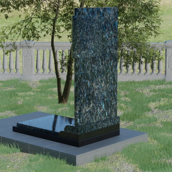 Геометрия модели продумана до мелочей: левая сторона стелы дополнена асимметричным вертикальным элементом с многоступенчатым завершением. Эта "ступенчатость" придает конструкции динамику и современный вид, выделяя её среди традиционных прямоугольных форм. Особое значение имеет сочетание фактур: идеально гладкая, зеркальная полировка основной части стелы эффектно контрастирует с шероховатой, тактильно приятной поверхностью боковых элементов. Зеркальный блеск гранита не только подчеркивает глубину цвета, но и защищает камень от внешних воздействий, позволяя мемориалу сохранять первозданный вид на протяжении столетий.