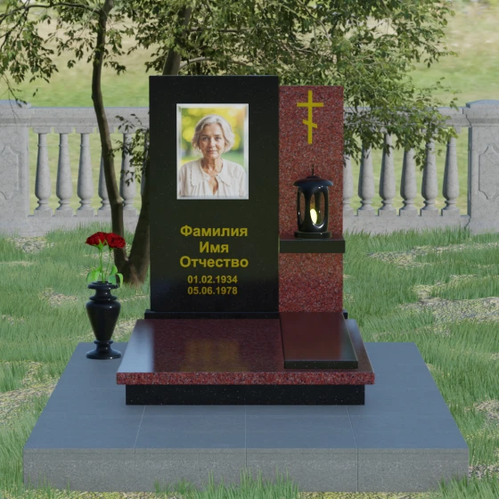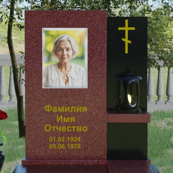 Представленная модель отличается изысканной асимметрией и сложной геометрией, где две вертикальные стелы разной высоты сливаются в единый гармоничный ансамбль. Левая часть, более высокая и массивная, имеет плавный дугообразный срез в верхней части. Этот мягкий изгиб символизирует бесконечность жизненного пути и обретенный вечный покой, смягчая строгость натурального камня. На этой панели располагается портрет и основная информация, выполненная глубокой гравировкой с золочением. Правая часть композиции, выполненная из контрастного камня, служит духовным акцентом: на ней закреплен лаконичный православный крест, сияющий золотом, что подчеркивает веру и надежду на вечную жизнь.