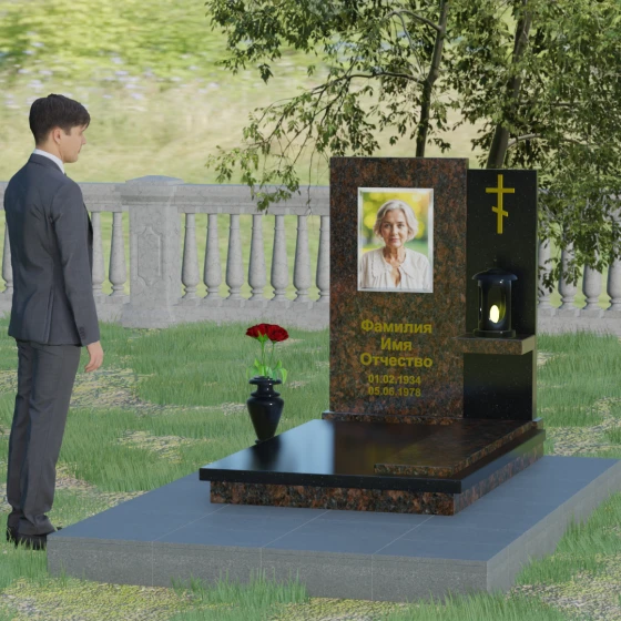 Кому подойдет: Данная модель является универсальной благодаря своему лаконичному и одновременно глубокому дизайну. Она станет достойным выбором как для мужчины, так и для женщины. Строгость линий и золотые акценты подчеркнут статус и мужество, а плавные изгибы верхней грани привнесут нотки женственности и нежности. Этот мемориал выбирают те, кто хочет выразить глубокое уважение и создать на кладбище место, преисполненное достоинства и тишины, где каждый элемент — от лампады до фактуры камня — говорит о вечной любви.