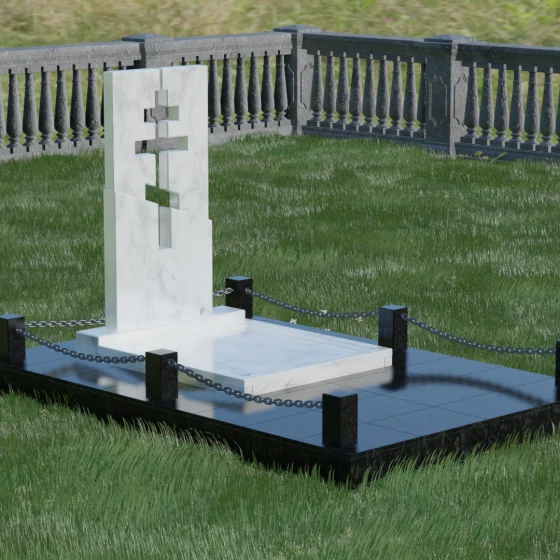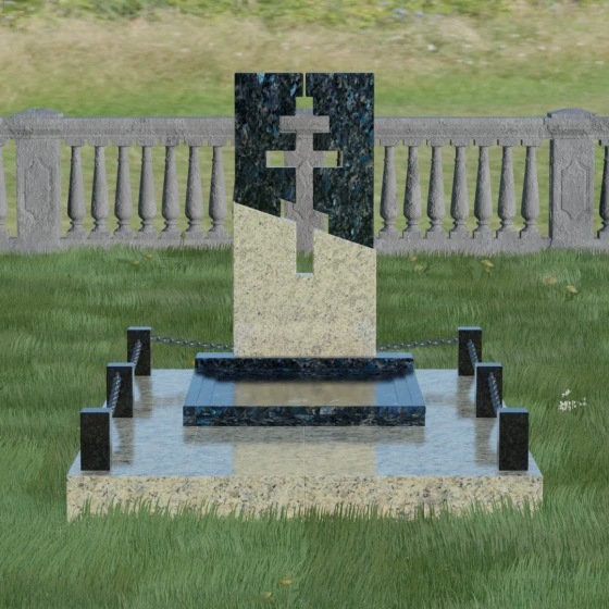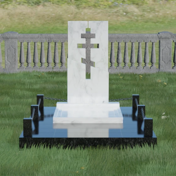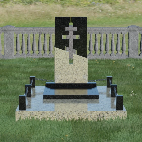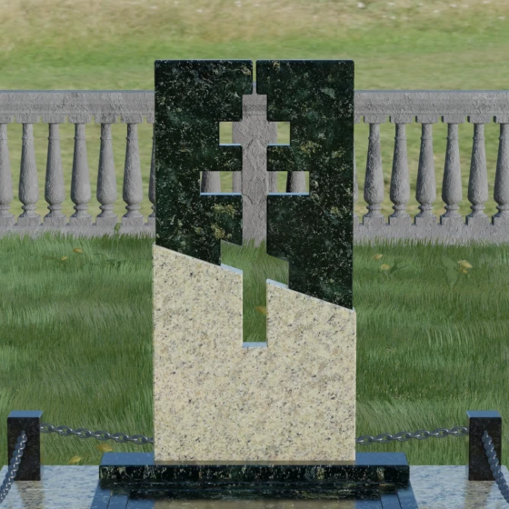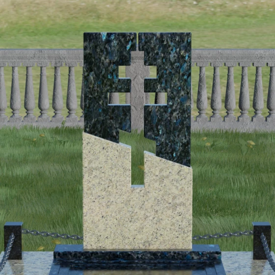 Данная модель — это торжество современной архитектуры и глубокого сакрального смысла. В центре композиции находится величественная стела, состоящая из двух контрастных блоков, разделенных динамичной диагональной линией. Этот художественный прием символизирует границу между земным и вечным, светом и тенью. Главной особенностью изделия является филигранная сквозная резьба: в самом сердце камня вырезан православный восьмиконечный крест. Лаконичность форм подчеркивает строгость и достоинство, а отсутствие лишнего декора позволяет сфокусироваться на главном символе веры.