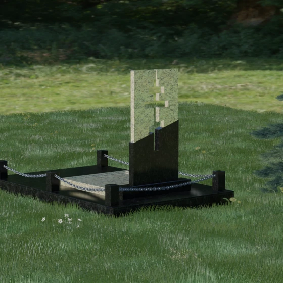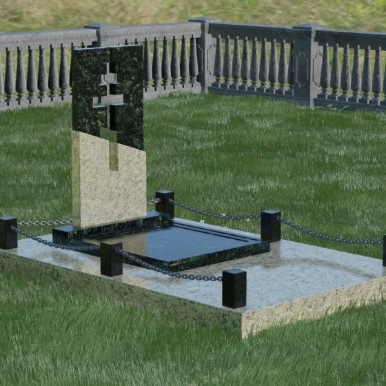 Особое внимание уделено комплексному благоустройству места захоронения. Скульптурная композиция установлена на массивный гранитный цоколь, который служит надежным фундаментом. Участок полностью закрыт сплошной надгробной плитой, выполненной в единой цветовой гамме со стелой. Такое решение не только придает мемориалу завершенный, монументальный вид, но и значительно упрощает уход за местом памяти: вам не придется бороться с сорняками или обновлять грунт. Периметр участка обозначен строгими каменными столбиками, соединенными декоративными цепями, что создает атмосферу защищенности и уединения, отделяя священное место от остального мира.