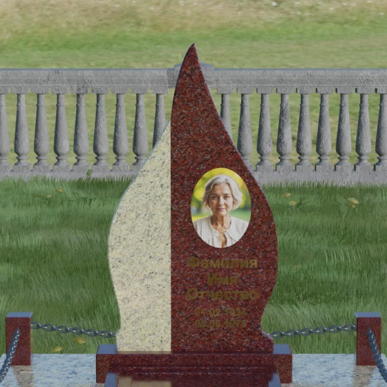 Выбор мемориального изделия — это всегда глубоко личный процесс, стремление выразить в камне ту нежность и уважение, которые мы храним в сердце. Модель 018 воплощает в себе гармонию и завершенность. Величественная стела выполнена в форме изящного, стремящегося ввысь пламени или капли, что символизирует вечный свет души и неугасаемую память. Асимметричная геометрия с мягкими, плавными изгибами лишена острых углов, что подчеркивает идею спокойствия и вечного упокоения. Особое внимание привлекает сочетание двух контрастных видов камня: светлая левая часть стелы с её благородной зернистой фактурой мягко огибает темную зеркальную сердцевину. Этот контраст создает визуальный объем и глубину, подчеркивая уникальность композиции и делая её заметной на фоне традиционных строгих форм.