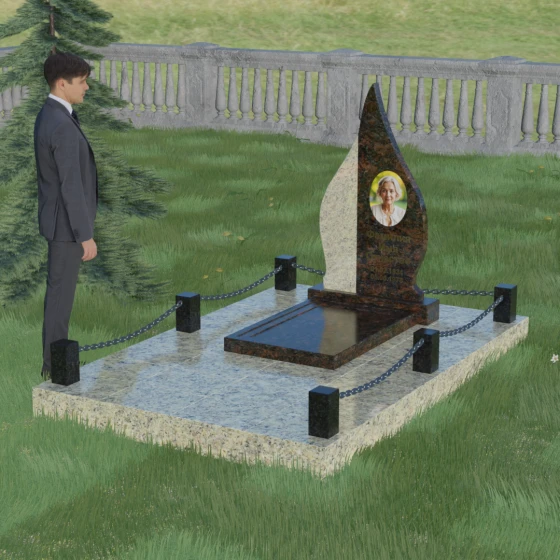 Конструкция модели 018 продумана до мелочей, включая полное благоустройство места захоронения. Монумент устанавливается на массивный двухцветный постамент, который обеспечивает устойчивость всей вертикальной конструкции. Особое внимание уделено обустройству прилегающей территории: вместо открытого грунта используется сплошное мощение плитами из натурального гранита. Это не только придает мемориальному комплексу законченный и достойный вид, но и значительно упрощает уход за ним, исключая появление сорняков и скопление грязи. Периметр участка обозначен строгим и лаконичным ограждением в виде невысоких каменных столбиков-боллардов, соединенных декоративными металлическими цепями. Такая ограда создает приватную зону, не загромождая пространство, и подчеркивает элитарность комплекса.