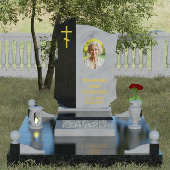 Форма стелы, сочетающая в себе прямые линии основания и волнообразный верх, символизирует земной путь, переходящий в бесконечность. Плавная волна отождествляется с чистотой помыслов и спокойствием, которое обретает душа. Вертикальный элемент с крестом выступает в роли духовного оберега, символизируя непоколебимую веру и защиту. Использование двух контрастных видов камня (светлого и темного) олицетворяет единство противоположностей: светлой памяти и земной печали, временного бытия и вечной жизни.