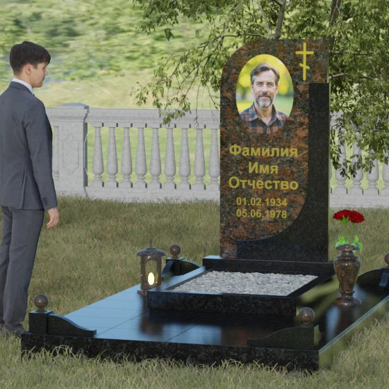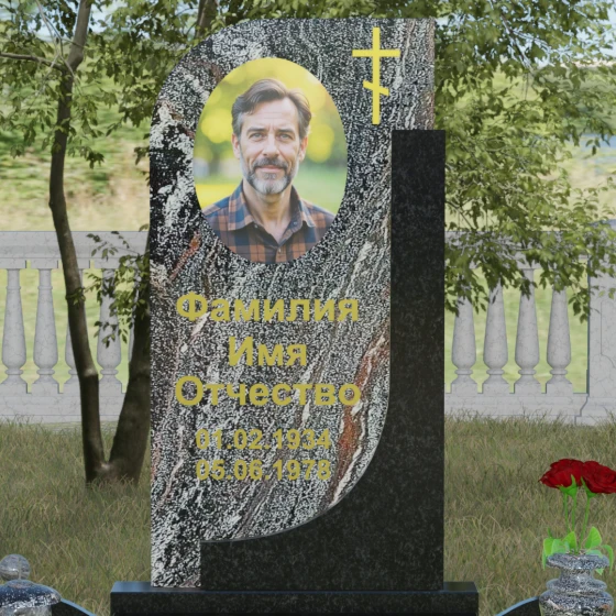 Кому подойдет: Данная модель является универсальной и гармонично впишется в мемориальный комплекс как для мужчины, так и для женщины. Асимметричная форма с плавным изгибом придает памятнику определенную легкость, что часто выбирают для оформления захоронений матерей или жен. В то же время строгая вертикальная колонна и золоченая символика делают его подходящим для увековечивания памяти отца, брата или главы семейства. Это выбор тех, кто ценит эстетику минимализма, надежность натуральных материалов и хочет подчеркнуть преемственность поколений и крепость семейных уз.