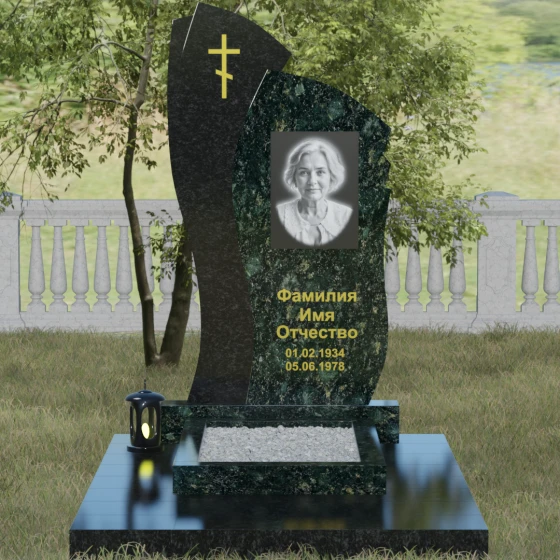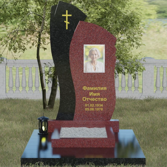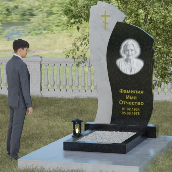 Данное ритуальное изделие представляет собой сложную художественную композицию, в которой мастерски обыгран контраст форм и материалов. В центре внимания — двухсоставная стела, объединяющая в себе мягкость восходящей линии и решительную геометрию скалы. Левый сегмент выполнен в виде изящной, тянущейся к небу волны из светлого камня, на которой лаконично расположился золоченый православный крест. Правая часть, служащая основанием для портрета, притягивает взгляд своей необычной обработкой: её внешний торец выполнен с каскадной, ступенчатой резкой, создающей эффект многослойности и глубины. Такая асимметрия символизирует сложность жизненного пути и возвышенность души.