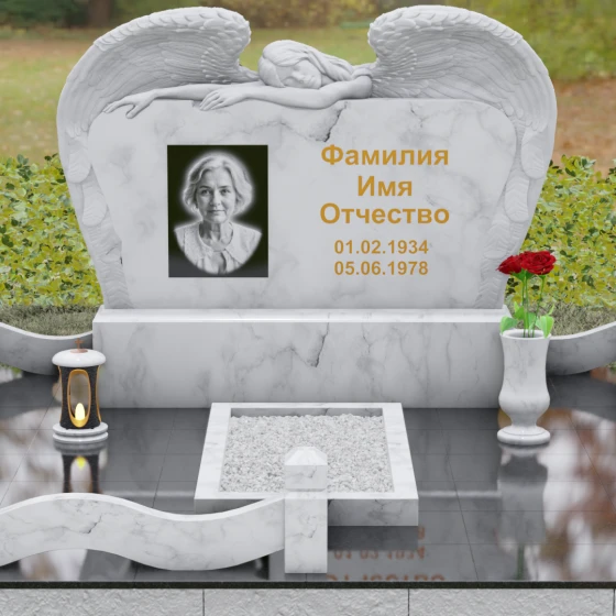 Представленный мемориальный комплекс (Артикул 130) является подлинным шедевром современной ритуальной архитектуры. Это не просто знак памяти, а монументальное художественное произведение, в котором гармонично сплелись суровая прочность природного камня и хрупкая нежность скульптурной пластики. Центральное место в композиции занимает величественная стела, выполненная в уникальном комбинированном стиле. Глубокий, антрацитово-черный массив основной плиты с безупречной зеркальной полировкой служит идеальным холстом для мемориальной гравировки. Его обрамляет искусно вырезанная из светлого камня фигура скорбящего ангела. Мастер добился поразительной детализации: вы можете видеть каждое перышко на мощных, распростертых крыльях, которые словно защищают покой ушедшего человека. Контраст между матовой, фактурной поверхностью резных элементов и глянцевым блеском основного камня создает невероятную визуальную глубину.