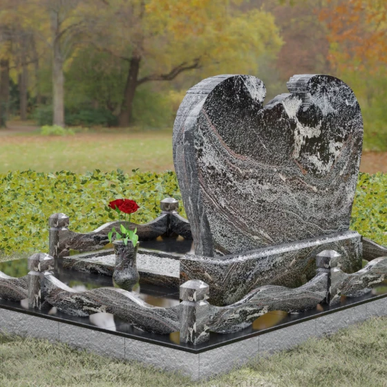 Геометрия комплекса продумана до мельчайших деталей, обеспечивая идеальный баланс форм. Горизонтальная ориентация стелы придает конструкции устойчивость и торжественность. Особое внимание уделено благоустройству прилегающего участка. Обелиск установлен на массивный гранитный цоколь, который не только приподнимает композицию над уровнем земли, но и защищает её от воздействия влаги. По периметру участок обрамлен изящным каменным ограждением: строгие столбики с пирамидальным завершением соединены плавными, волнообразными перемычками, повторяющими изгибы самой стелы. Вместо открытого грунта используется сплошная полированная плита с небольшим декоративным вырезом под цветник, заполненным белоснежной мраморной крошкой. Такое решение гарантирует эстетичный вид участка на десятилетия, полностью избавляя от необходимости борьбы с сорняками.