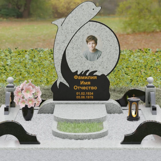 Этот гранитный монумент представляет собой не просто мемориальный знак, а настоящую художественную композицию, преисполненную глубокого символизма. Центральное место в дизайне занимает фигура дельфина — древнего символа спасения, чистоты и проводника душ в лучший мир. Плавный, динамичный изгиб морского обитателя словно обнимает центральный медальон, создавая защищенное, камерное пространство для портрета близкого человека. Мастера добились удивительной игры контрастов: зеркально отполированное туловище дельфина эффектно выделяется на фоне матовой, детально проработанной резьбы в основании, имитирующей морскую пену и гребни волн.