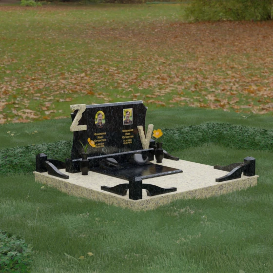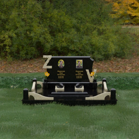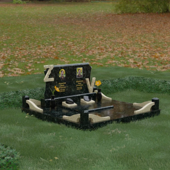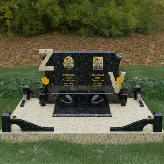 Центральным элементом изделия является массивная горизонтальная стела, обладающая сложной многоуровневой геометрией. Верхняя грань плиты украшена изящными симметричными вырезами, которые смягчают строгость прямоугольных форм и придают конструкции завершенный, эстетически выверенный вид. Особое внимание привлекает игра контрастов: глубокая зеркальная полировка основного массива камня эффектно подчеркивается светлыми вставками. Рельефные буквы Z и V, выполненные из контрастного гранита, выступают над поверхностью, создавая впечатляющий эффект объема и наделяя монумент уникальным характером.