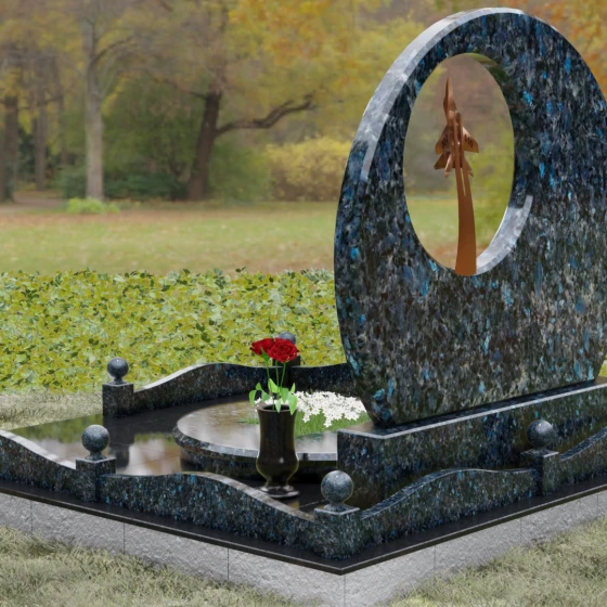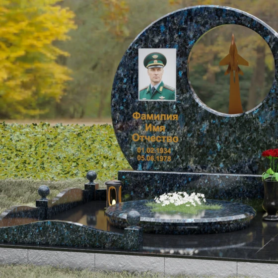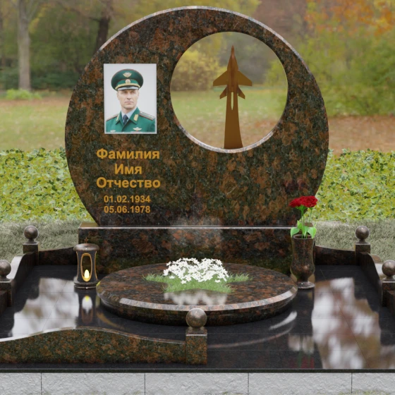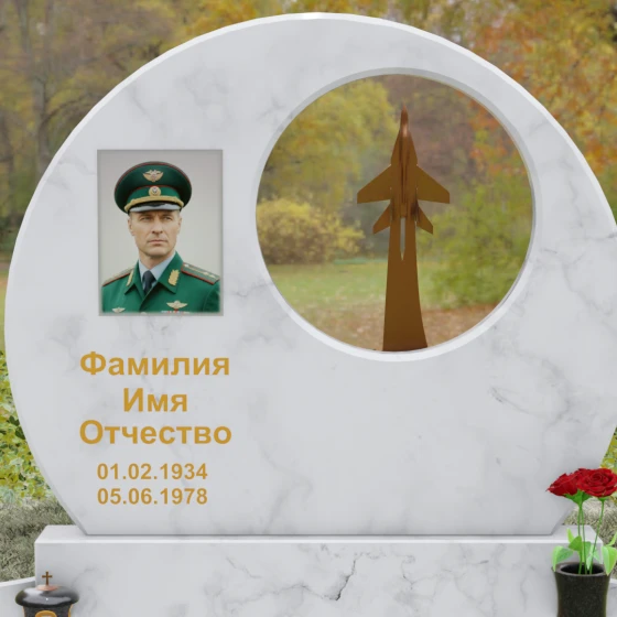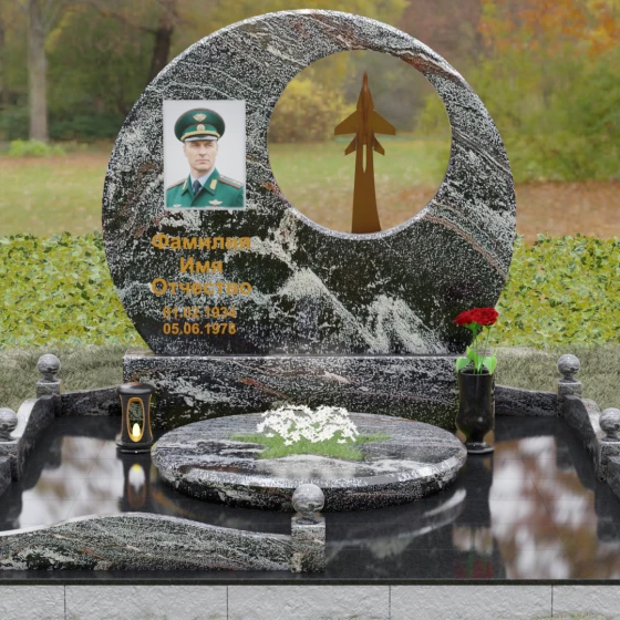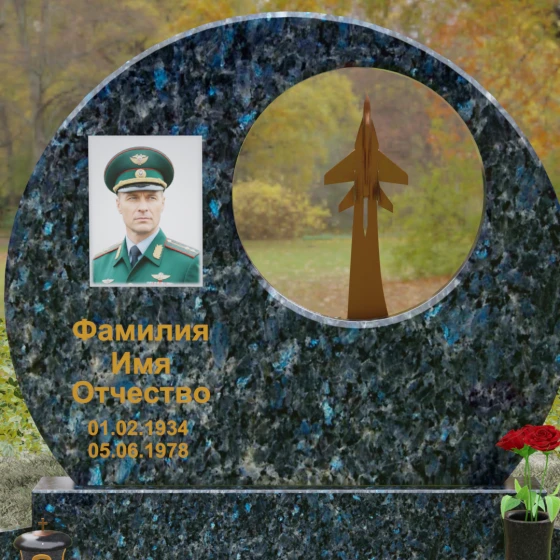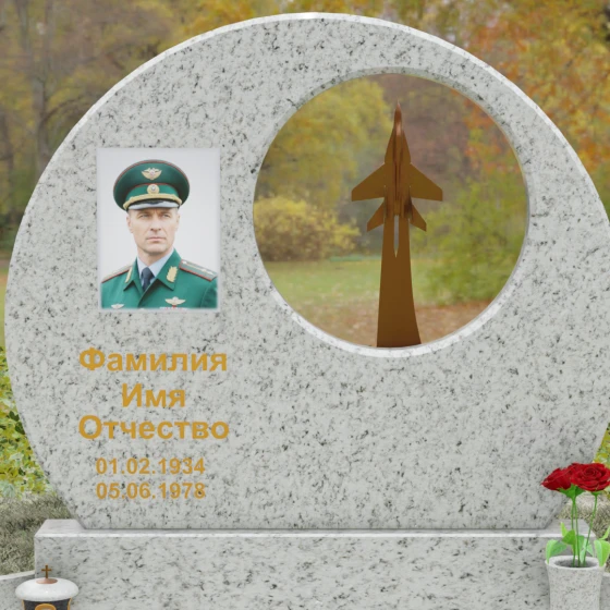 Выбор мемориальной композиции — это всегда поиск баланса между земной скорбью и небесным триумфом человеческого духа. Данная величественная стела, выполненная в уникальной геометрии круга с асимметричным сквозным вырезом, представляет собой не просто памятный знак, а глубокое философское высказывание. Символизм окружности отсылает нас к идее бесконечности, небесного свода и завершенности жизненного пути. Внутреннее пространство стелы акцентировано филигранной металлической фигурой взмывающего ввысь истребителя. Этот элемент несет в себе мощный эмоциональный заряд: он олицетворяет прорыв сквозь земные преграды, вечный полет и верность призванию, которое сильнее самой смерти.