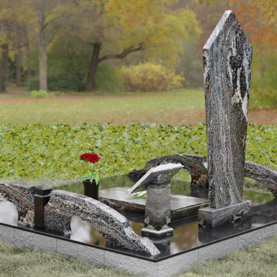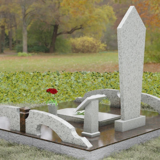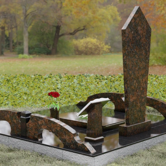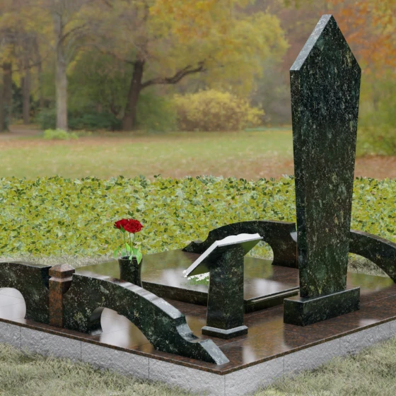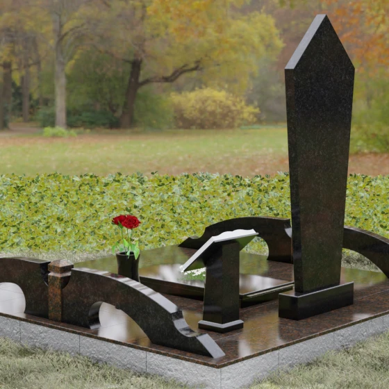 Данная модель предполагает комплексное решение по благоустройству участка. Памятник устанавливается на массивный двухступенчатый постамент, обеспечивающий надежную устойчивость конструкции. По периметру захоронения предусмотрен гранитный цоколь — строгий каменный бордюр, который визуально очерчивает границы мемориала и придает ему завершенный вид. Рядом с основной стелой располагается дополнительный элемент в форме раскрытой книги на наклонном гранитном основании. Это изящное дополнение служит идеальным местом для размещения эпитафии или памятных слов. В состав комплекса также входит лаконичная гранитная ваза, позволяющая поддерживать порядок и эстетику в оформлении цветами.