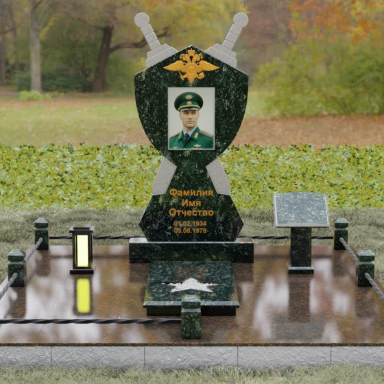 Кому подойдет: Данная мемориальная композиция разработана специально для тех, кто посвятил свою жизнь служению Отечеству. Она станет идеальным выбором для оформления места захоронения профессионального военного, сотрудника правоохранительных органов, ветерана или человека, чья жизнь была примером мужества и дисциплины. Строгие линии, военная символика и монументальность формы без лишних слов расскажут о силе характера, доблести и чести того, кто нашел здесь свой последний приют.