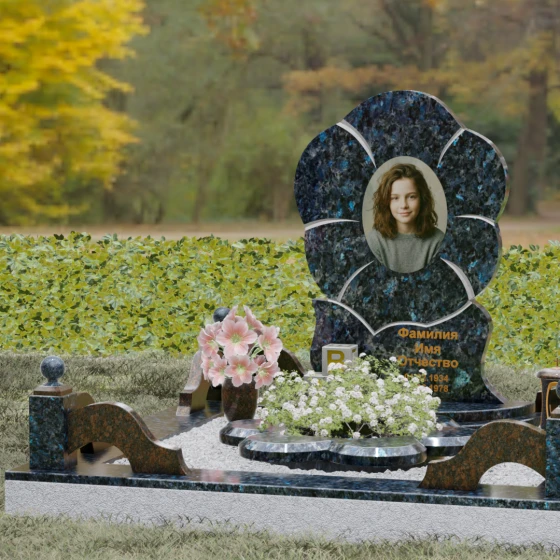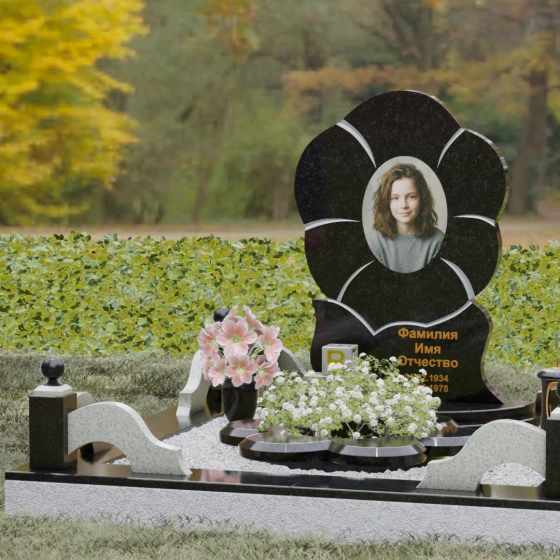 Каждая деталь этого проекта наполнена глубоким смыслом. Цветок в мемориальной пластике традиционно символизирует чистоту души, её расцвет и вечную весну в ином мире. Плавные, текучие линии боковых граней олицетворяют покой и отсутствие земных тревог. Декоративные резные блоки у основания напоминают о начале жизненного пути, о безмятежности и искренности, что делает эту модель особенно подходящей для увековечивания молодых и светлых личностей. Этот ансамбль создает ощущение защиты и умиротворения, превращая место захоронения в пространство светлой печали.