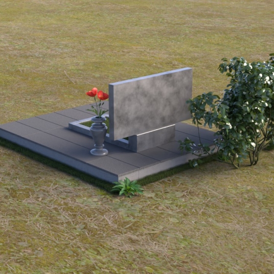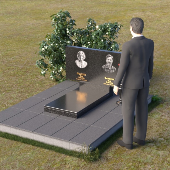 Представленный памятник (артикул ПГ001) являет собой образец строгости и лаконичности, где каждая деталь подчинена общей концепции увековечивания памяти. Композиция состоит из основания, облицованного серыми плитами, горизонтальной плиты, и вертикальной плиты с портретами. Дополнительно предусмотрена тумба для вазы.