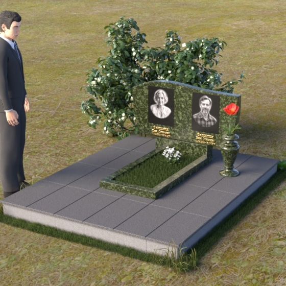 Этот памятник являет собой образец мастерства в обработке камня. Особое внимание привлекает игра контрастов: зеркально отполированный гранит, отражающий небо и окружающий мир, и деликатно выгравированные портреты усопших. Лаконичная ваза, выполненная в том же стиле, что и стела, гармонично дополняет композицию и служит местом для живых цветов, символизирующих вечную память и любовь.