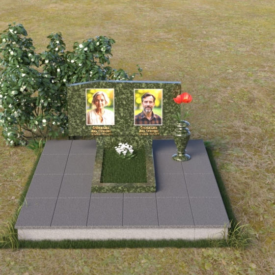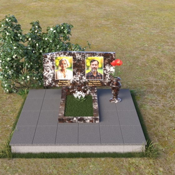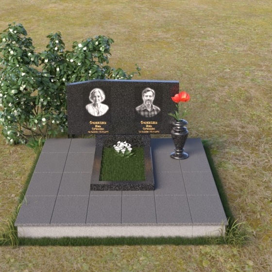 Основным элементом композиции является вертикальная плита, возвышающаяся над прямоугольным основанием. Гранитная плита имеет слегка вогнутую форму верхней грани, что придает ей мягкость и визуально облегчает массивность. На отполированной до зеркального блеска поверхности выгравированы портреты усопших, выполненные с высокой степенью детализации. Под портретами располагаются надписи с именами и датами жизни, выполненные строгим шрифтом. Вся композиция пронизана чувством сдержанности и достоинства, что позволяет сосредоточиться на главном – на памяти о тех, кого больше нет рядом.