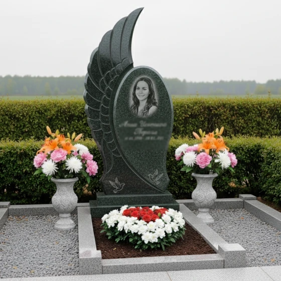 Кому подойдет: Этот мемориальный комплекс идеально подойдет для тех, кто ищет не просто памятник, а уникальное произведение искусства, способное глубоко и трогательно выразить светлую память о близком человеке. Его плавные, обтекаемые формы и символика крыла делают его особенно подходящим для увековечивания памяти о женщинах, чья жизнь была наполнена нежностью, грацией и духовностью. Мемориал станет достойным символом вечного покоя и возвышенной памяти, отражая индивидуальность и значимость ушедшего. Возможность выбора из 8 цветовых решений — 7 видов гранита (гранит амфиболит, гранит Балтик грин, гранит Блю Перл, гранит Габбро-диабаз, гранит Дымовский, гранит Лезниковский, гранит Мансуровский) и 1 вид мрамора (мрамор Тассо) — позволяет подобрать камень, который наиболее точно соответствует характеру и предпочтениям усопшего, создавая по-настоящему персонализированный и глубоко символичный мемориал.