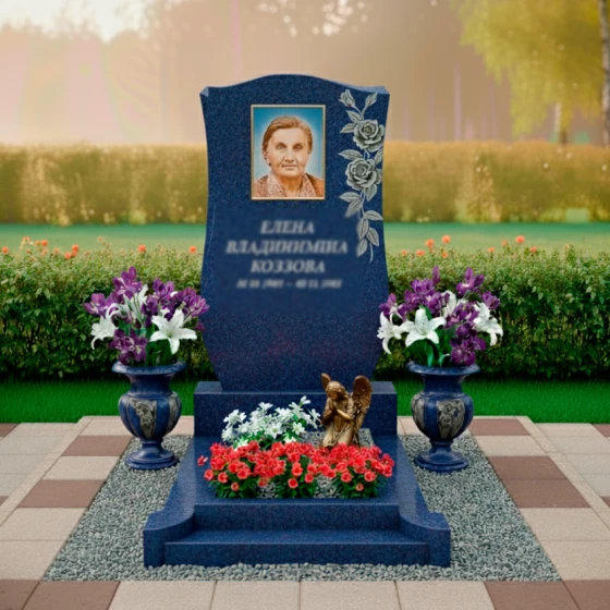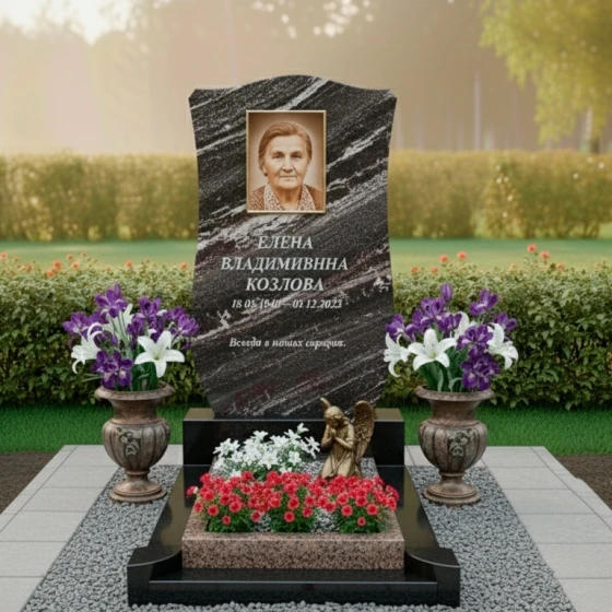 Представляем вашему вниманию ритуальное изделие Артикул: ПН 139 — воплощение глубокой скорби и нежной памяти, запечатленное в камне. Эта надгробная композиция призвана стать достойным символом уважения к ушедшему, сохраняя его образ в вечности. Основу композиции составляет элегантная стела из черного гранита, чьи зеркально отполированные грани искусно отражают окружающий мир, создавая завораживающую игру света и тени. Ее форма напоминает раскрытую книгу или свиток, символизируя жизненный путь, который был пройден, и истории, которые навсегда останутся в сердцах близких. Верхняя часть стелы изящно изогнута, словно мягкая волна, а боковые грани плавно сужаются к основанию, придавая изделию утонченность и легкость, несмотря на массивность камня.