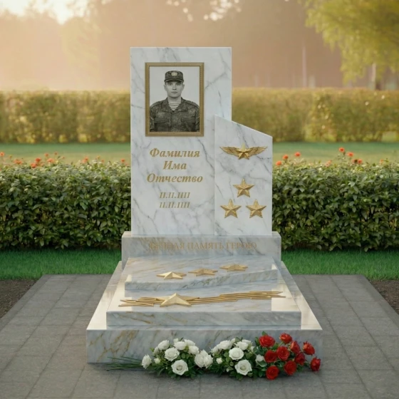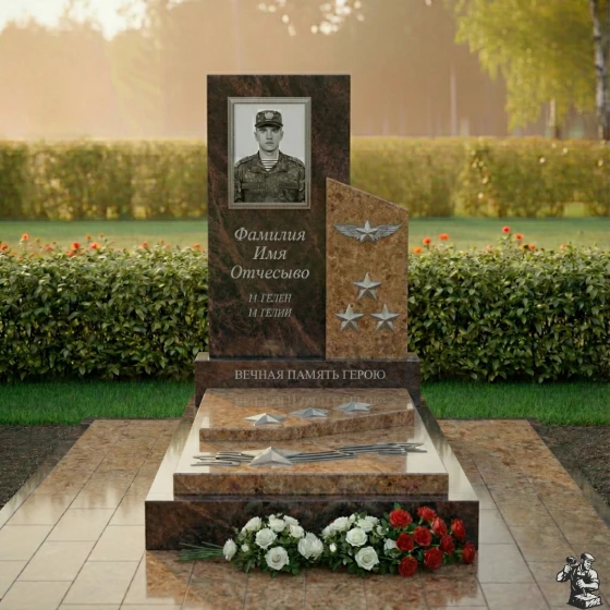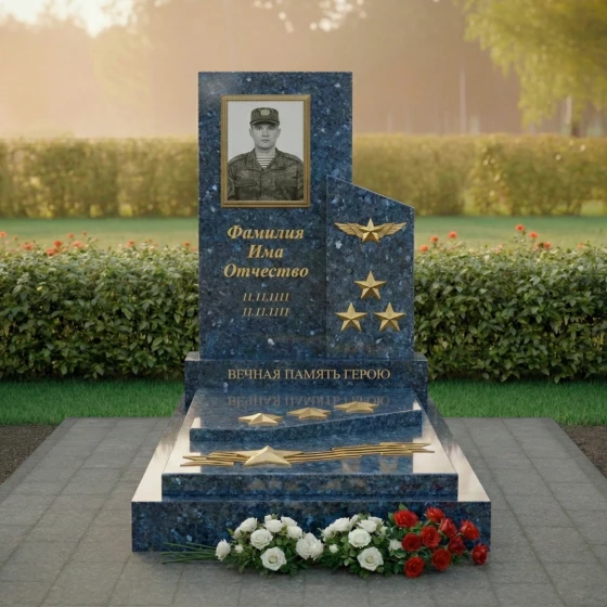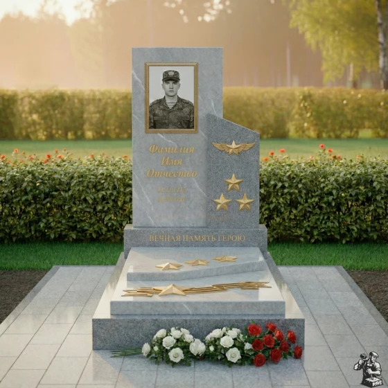 Особое внимание привлекает правая часть композиции, где изящно вырезан фрагмент, напоминающий развевающееся знамя или взлетающую птицу, словно символизируя вознесение души. Эта часть выполнена из камня с глубоким, насыщенным зеленым оттенком и имеет матовую, шероховатую фактуру, создающую благородный контраст с полированной чернотой. На ней расположены три объемные золотые звезды, символизирующие воинскую доблесть и заслуги, а также пара изящных, рельефных крыльев, будто готовых взмыть в небо. Эти элементы выполнены с потрясающей детализацией, каждый изгиб и линия проработаны с ювелирной точностью, придавая монументу особую выразительность и значимость.