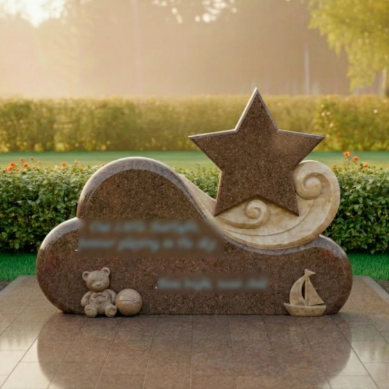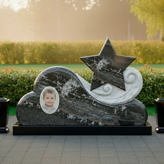 Особое внимание привлекает игра контрастов, мастерски воплощенная в этом монументе. Основная часть, выполненная из глубокого черного гранита, отполирована до зеркального сияния, в котором отражается свет и надежда. На этом фоне выделяется изящный элемент в виде стилизованной звезды, выполненный из светлого мрамора с его неповторимыми прожилками. Звезда, как символ путеводного света и вечной души, поднимается над облаком, указывая на небесный путь. Ее матовая, нежная поверхность создает гармоничный контраст с блестящим черным гранитом, подчеркивая тонкую работу мастера. Вокруг звезды, словно легкий вихрь или нежные волны, вырезаны спиралевидные элементы из того же светлого камня, добавляя композиции динамики и воздушности. В нижней части монумента, на его основании, расположены трогательные резные фигурки: милый плюшевый медвежонок с мячом и изящная лодочка. Эти элементы, выполненные из светлого камня, символизируют невинность детства, мечты и путешествие души, создавая глубоко личный и трогательный образ. Их мягкие, сглаженные формы идеально вписываются в общую концепцию плавности и нежности.