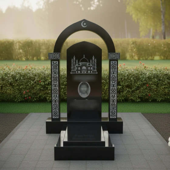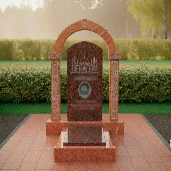 Центральным элементом ансамбля выступает величественная арка, увенчанная символами веры — полумесяцем и звездой. Округлая форма свода, выполненная с безупречной точностью, символизирует небесный купол и бесконечность бытия. Плавные изгибы верхней части композиции, переходящие от высокого навершия к мягко скругленным граням центральной плиты, олицетворяют завершение земного пути и обретение вечного умиротворения. Внутри арки расположена мемориальная плита, на которой методом художественной резки нанесен детализированный силуэт мечети. Тончайшая работа мастеров позволяет увидеть каждый купол и минарет, создавая эффект объема и торжественности.