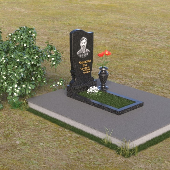 Величественная стела памятника ПВ 015 выполнена в строгой, но элегантной форме. Верхняя часть памятника имеет плавный, волнообразный силуэт, что придает ему мягкость и изящество. Сглаженные углы и отсутствие острых граней создают ощущение покоя и умиротворения. Боковые грани стелы слегка скошены, что визуально облегчает конструкцию и добавляет ей динамичности. Фаска, обрамляющая верхнюю часть памятника, подчеркивает его контур и придает завершенность образу. Нижняя часть стелы, переходящая в тумбу, имеет строгую прямоугольную форму, обеспечивая устойчивость и надежность всей конструкции. Зеркальная полировка поверхности камня отражает окружающий мир, создавая ощущение глубины и света. На стеле располагается портрет усопшего, выполненный с высокой точностью и детализацией, а также памятная надпись, нанесенная золотыми буквами.