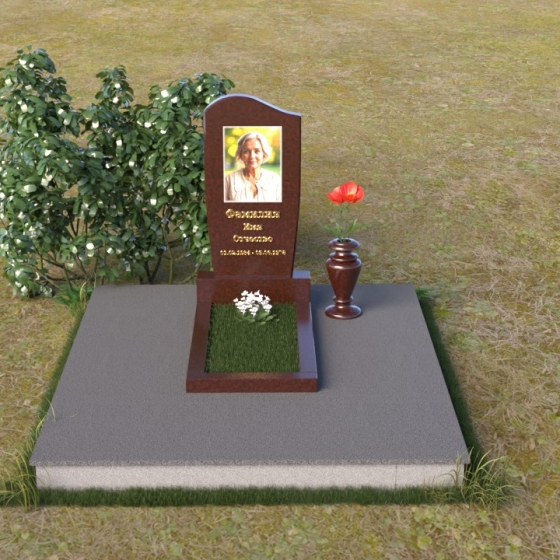 Форма стелы, тяготеющая к классической прямоугольной, предоставляет широкие возможности для персонализации. Портрет усопшего, расположенный в верхней части, будет выгодно подчеркнут лаконичной формой камня. Золотистое начертание имени и дат жизни, выполненное с особым вниманием к деталям, отчетливо выделяется на фоне полированного гранита, создавая четкий и легко читаемый текст. Дополнительно можно разместить эпитафию или памятные слова, которые отразят личность и жизненный путь ушедшего человека. Маленькая гранитная ваза, выполненная в едином стиле с мемориальной композицией, станет достойным обрамлением для живых цветов, привносящих нотку жизни и надежды.