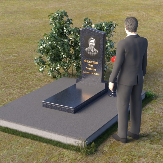 Этот гранитный монумент представляет собой композицию из двух основных элементов: вертикальной плиты с портретом и горизонтальной накладки. Вертикальная плита, возвышающаяся над землей, имеет строгую прямоугольную форму с небольшим скосом в верхней части. Это придает монументу сдержанную элегантность. Зеркальная полировка поверхности отражает свет, создавая ощущение глубины и сияния. На плите выгравирован портрет усопшего, выполненный с высокой точностью и вниманием к деталям. Ниже портрета располагается надпись с именем и датами жизни, выполненная золотым шрифтом. Горизонтальная накладка, расположенная в нижней части, также выполнена из черного полированного гранита и служит своеобразным пьедесталом для вертикальной плиты. Ее гладкая поверхность создает дополнительный контраст с окружающей средой. Рядом с монументом установлена ваза из черного гранита, предназначенная для живых цветов.